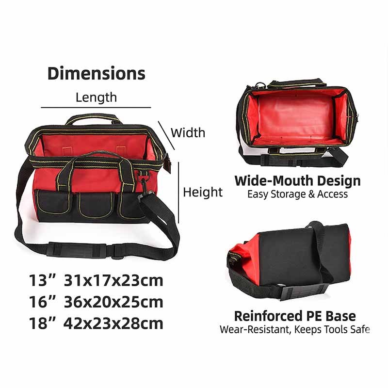 • Three versatile sizes:13″ (31x17x23cm): Compact for basic hand tools and daily home repairs. ✓ 16″ (36x20x25cm): Standard capacity for mixed hand tools and small power tools. ✓ 18″ (42x23x28cm): Extended capacity for bulky equipment and extensive professional toolsets.